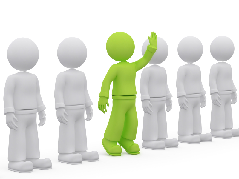 Volunteer. Published December 7, 2013 at 800 × 600 in R Standing out from the crowd concept. One green character among five others white, wishing to be the volunteer. Isolated on white background with soft shadows. XXXL 3D rendered image.